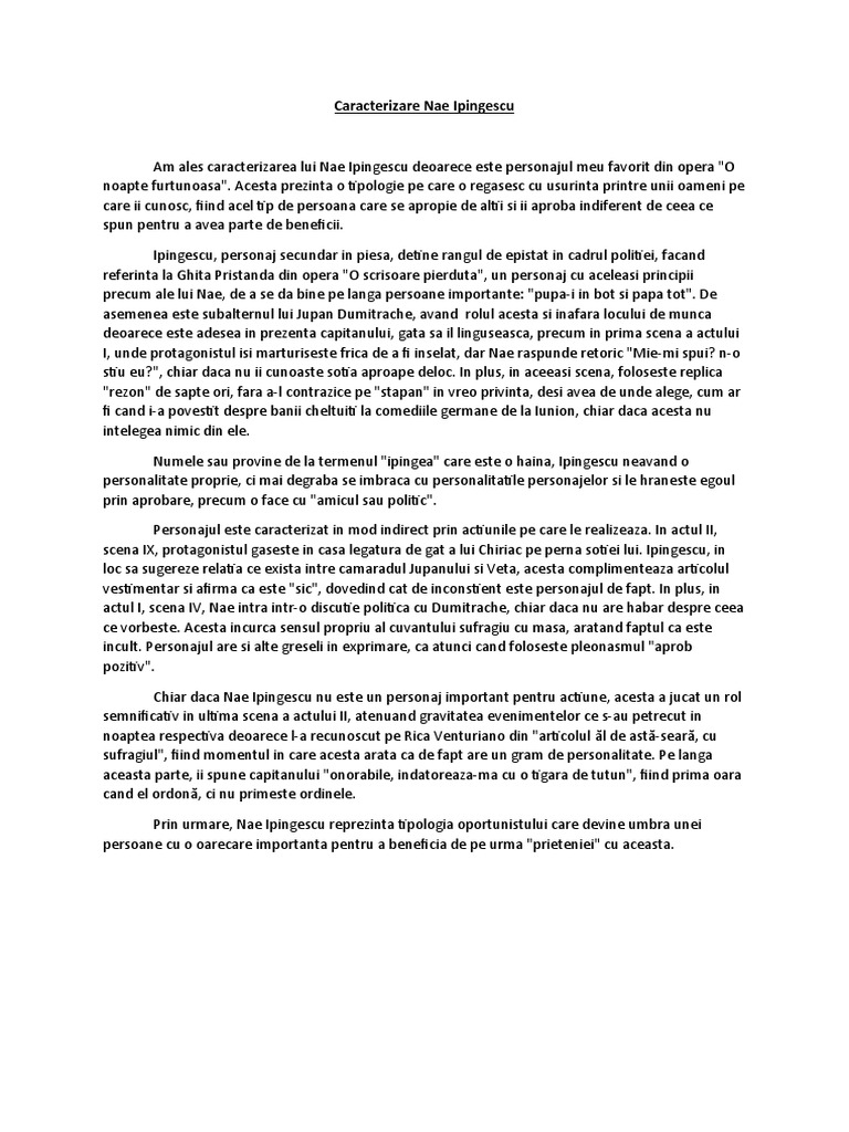 Acest articol se referă la o piesă de teatru de i.l. Caracterizarea personajului jupan dumitrache din opera o noapte furtunoasa scrisa de i. · ce loc ocupă personajul în operă? Caracterizarea personajelor baltagulmihail sadoveanu romanul baltagul ramane o scriere remarcabila si prin personajele sale.exista personaje principale, secundare si. Din zori si pana in noapte, neobosita, ea stie sa faca fata nevoilor unei goapodarii grele, lucrand totodata la sumanele pe care barbatul ei le vindea in targuri.